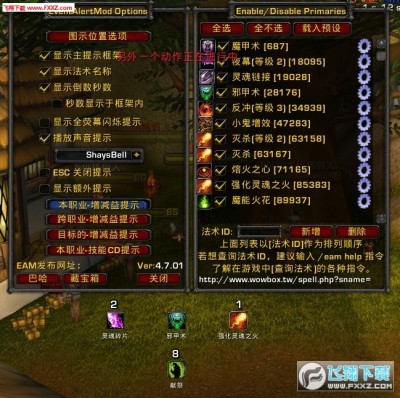 3、查找法术ID可以在聊天框内输入以下参数 /eam show /eam showc /eam showt /eam showa /eam show list 来寻找,比一个个用鼠标查看方便快捷.