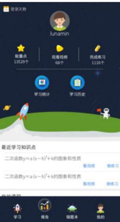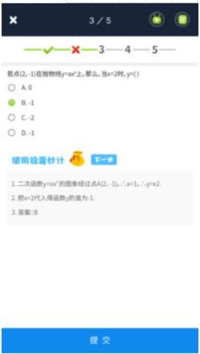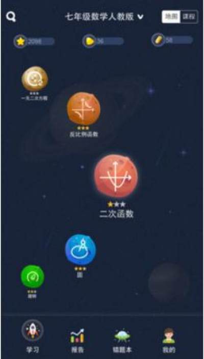 在学生端,“寻知图”以各个学科知识图谱为核心,提供知识导航图和课程目录两种视图,学生在每个知识点上完成看视频、做练习、拓展学习的学习活动。特别值得一提的是,“寻知图”在学生进阶练习的过程中不允许跳过,每道题提供了帮助解题的“锦囊妙计”,引导学生一步一步得到正确答案,确保对知识点的真正掌握。在每次学习活动完成后,“寻知图”会向学生提供能量点激励,这种既奖励结果也奖励学习过程的设置,有助于强化内在学习动机,在一定程度上解决了在线学习因缺乏强制性而导致的学习效果无保证的难题。