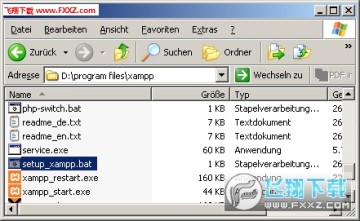 本图中,我们将 XAMPP 解压到“D:\program files”路径下的“D:\program files\xampp”文件夹中。之后,打开 XAMPP 所在的文件夹,并运行其中的“setup-xampp.bat”。