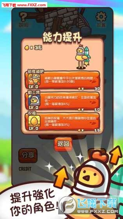 您更可以为呆鸡升级,令到呆鸡在每层的停留时间更长,以挑战更高的难度。