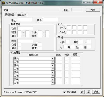 本修改器是由国内玩家打造,适用于神圣纪事V1.8.26版+PLUS加强版,是一款功能全面的修改器,特别是对装备各属性的修改非常好用.