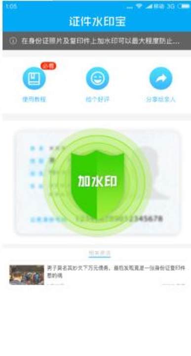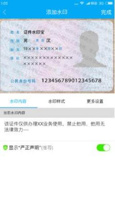 证件水印宝可一键给身份证照片加上文字水印,防止他人恶意盗用。 使您能够为你的照片添加水印。所以,你可以迅速投入你的照片你的属性的文字或形象标识,设置参数,如大小,透明度,旋转,对齐方式等,然后保存结果并共享。