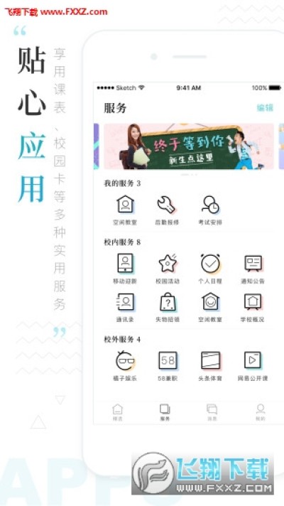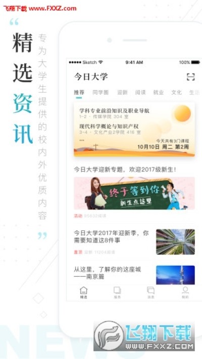 校内动态:本校新闻、校园周边信息实时更新;校外热点:新鲜热文、实用资讯精选推荐;更有专业内容合作方(如掌阅、智联招聘等)提供的深度内容呈现