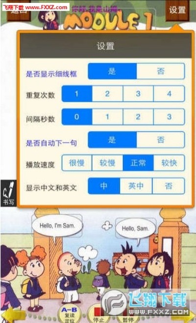 3.本程序除了像普通点读机一样能点读课本外,还能设置【是否自动下一句】、【朗读重复次数】、【朗读延时间隔】、【显示中文和英文】、【点读声音速度调节】功能。