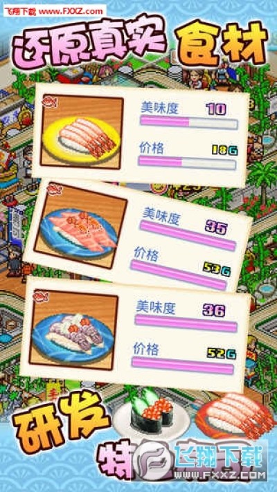 《海鲜寿司物语安卓版》是一款开罗公司出品的像素风模拟经营类手游,游戏的中玩家可以经营一家回转寿司店,通过参加比赛等提高的自己的知名度并不断提升自己的规模,喜欢的玩家快来下载试试吧!