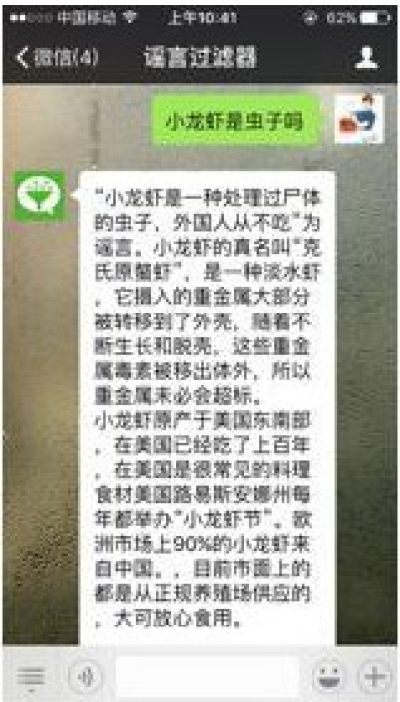例如,用户向辟谣小助手发送“小龙虾是虫子”的信息,就可以得到相应的辟谣回复。以后,大家在遇到存疑的谣言时便可及时向辟谣小助手求证,避免因为谣言扩散而引起不必要的恐慌。