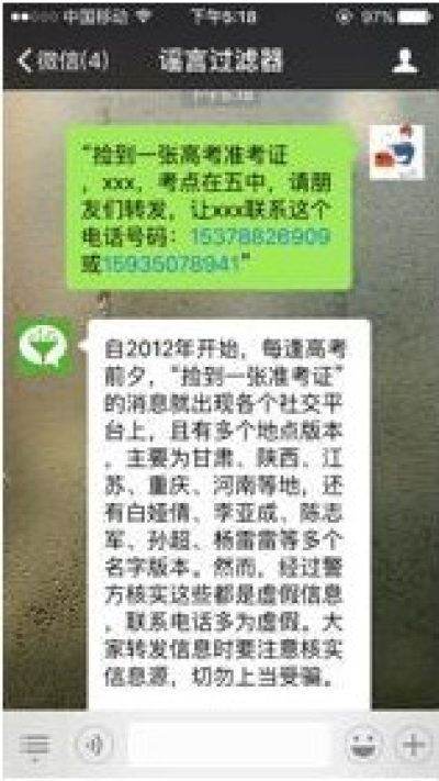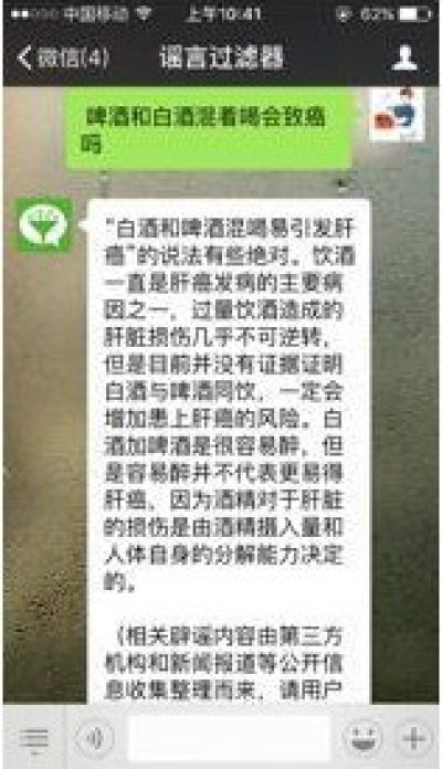 用户只需进入“谣言过滤器”的公众号,直接将谣言复制、粘贴过来,或向公众号发送谣言的主要内容,就可以得到辟谣小助手自动回复的辟谣信息。