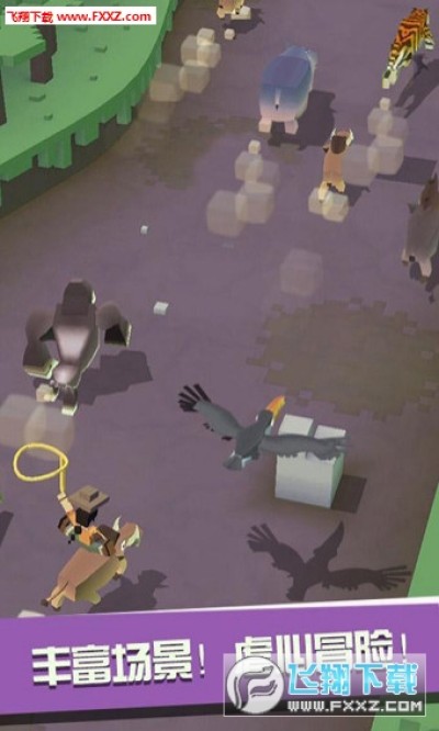 疯狂动物园UC最新版是一款集3D像素、急速跑酷和模拟养成为一体的休闲小游戏。在游戏中你将扮演一名富有冒险精神的绝世牛仔。在高速移动的情况下与各种动物一较高下。你要尽可能多的套住动物,将它们统统带回飞船上的“空中动物园”中饲养;并进行园区升级,以便迎来世界各地的游客光临赚取更多金币!