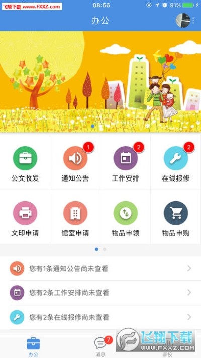 为了更好的服务于全校师生,目前已推出服务包括通知公告、工作安排、在线报修、文印申请、请假管理等功能。