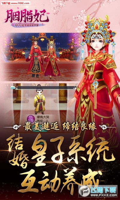 《胭脂妃》是一款超唯美3D换装宫斗手游来袭!Q萌宫斗全新升级,打造前所未有的3D华美战国!华衣霓裳,百变宫装随心搭配,要换就换的彻底!发饰、表情、服饰、鞋子随心配,3D高精密度模型,服饰细节精致考究。更有华服大赛、时装传记等丰富玩法,让你秀出最美的自己!洞房花烛,喜得麟儿望子成龙 结发为夫妻,恩爱两不疑。浪漫结婚系统让有情人终成眷属。只是在一起当然还不够,和ta一起养育爱情的结晶吧!