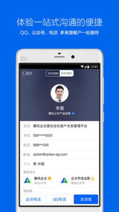 腾讯企点是中国领先的SaaS级客户关系管理平台(CCM: customer communication management),目前包含“企点服务”、“企点电话”两大产品模块。 企点服务可为企业高效管理多个社交平台,留存来自不同渠道的客户线索,洞察客户需求,并进行精细化客户关系管理,帮助企业利用多样化的社交互动方式实现营销转化。
