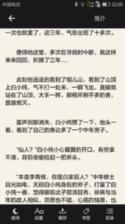 小说缓存、小说书架、书架同步、日间阅读模式、夜间阅读模式、字体大小、翻页效果,完美展现,为您提供最好的阅读体验。