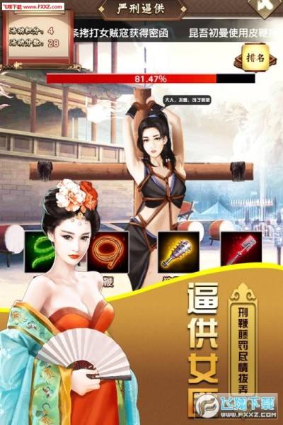 表面平静的王朝,暗流却一直涌动,为了巩固王权,只能用权力扫清逆贼,毕竟“有权是可以为所欲为的”。收押罪犯,藤鞭棍棒,各种刑具由你挑选。如果女匪落入手里,结果可就,嘿嘿嘿……