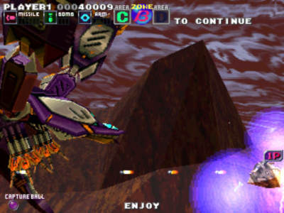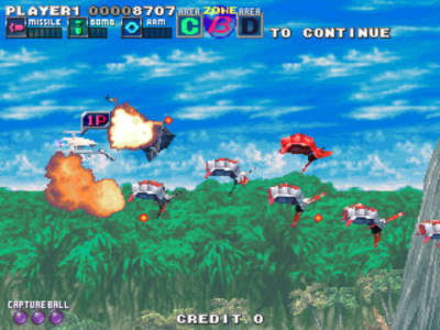 这种伪3D的飞行射击游戏有时候真的让人有种淡淡的忧伤,敌机就那么不经意的从你的前面绕到了后面,你还要转个面射击。而且游戏的难度对于入门级的玩家来说着实有点偏高呀。不过在满2D的飞机游戏里能掺入3D元素也算是一个奇葩。通过MAME模拟器可以正常运行。不过游戏一开始需要点击左右方向键才能开始游戏。