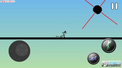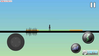 3、点击屏幕两旁的控制触摸盘和动作切换盘来控制火柴人的前进跳跃等,不断的向前奔跑,穿过一个个的障碍。