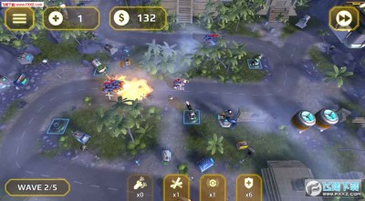 初始防御塔只有四种,高射速的机枪塔、堵路用的坦克厂、没有AOE效果的导弹塔、单体高伤害的激光塔,塔的升级系统也很标准…