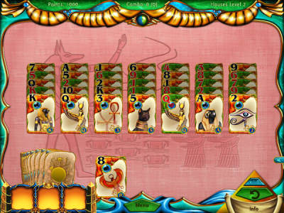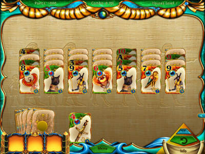《埃及纸牌接龙》与大多数的纸牌接龙游戏一样,规则为翻动下面的牌组,将上面的牌按照或正或逆的顺序收下来,只是将游戏的主题换成了埃及背景。游戏的剧情讲述的是一场巨大的沙尘暴摧毁了尼罗河边的一座城市,你将帮助法老重建该城市。