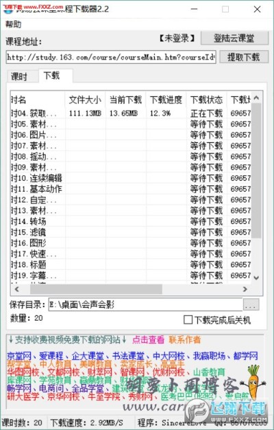 以聂长飞老师的《会声会影x10原创视频教程之基础篇》为例,复制网址,然后打开网易云课堂下载器,然后把网址粘贴到下载器中,http://study.163.com/course/courseMain.htm?courseId=1003789021,点击提取下下载,然后点添加下载,然后到下载页面点击开始下载就行了。网易那边服务器速度非常快,满速下载,就看你自己本地宽带网速有多快,下载速度就有多快。