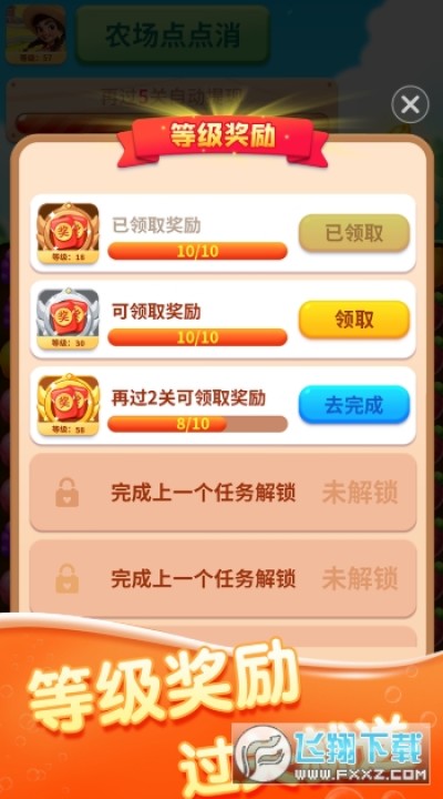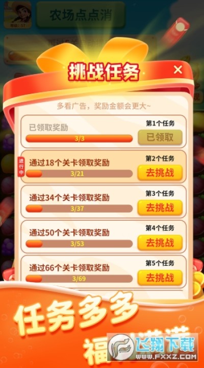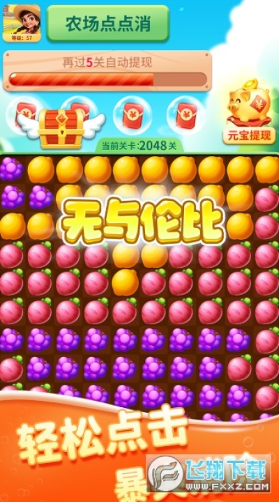 农场点点消红包版是一款极具特色的农场消除游戏,玩家需要通过点击相邻的农作物来消除并获取积分。每一关都有不同的目标和限制条件,例如限时完成、破冰解锁等,规则简单易懂,但通关需要手眼协调能力和策略思维的结合。游戏画面清新自然,音效美妙动听,让玩家身临其境。