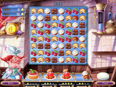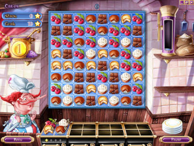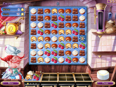 蛋糕迷情是一款消除类的游戏,玩家将会帮助糕点师Henri制作各式各样的高点,游戏采用的是交换相邻图标消去的经典模式,每一种图标就是一种材料,根据下面给出的所需材料进行选择性消除,收集足够的材料来制作蛋糕,在规定时间内将下面需要的蛋糕全部做出即为过关。游戏的故事模式包括15个章节,60个关卡,随后你也可以开启街机模式选择等级进行挑战,不仅可以在游戏开始前选择你从商店中购买的道具,还包括众多奖章等待你来收集。