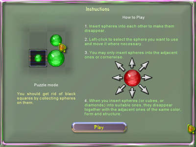 每种颜色分大、中、小三种大小,同一种颜色可以互相套入。当大中小一样一个集中在一起,便能消除。如果最后移动的宝石在消除时附近有连续的同类型宝石,还可以一起消除,并且游戏中还有例如爆炸效果的特殊宝石,等待着玩家的发掘。