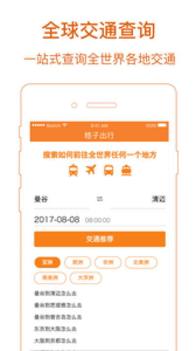 桔子出行APP提供全世界任何两地之间的交通方式查询,包括飞机、火车、汽车、轮船等,覆盖全球108291条火车线路,829829条巴士线路,5289条独轮线路以及50281条航班,覆盖全球100多个国家。