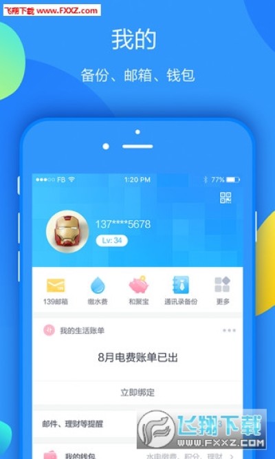 集成个人信息展示,用户权益及个性化设置专区。用户可以完成水电缴费,使用移动积分商城、139邮箱、备份、12580商城等移动精品功能,还能及时知晓用户权益、信息的个人中心。