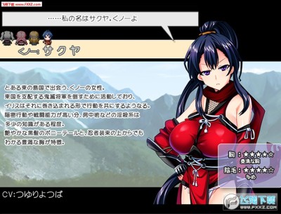 在东边的岛国相遇,一名女性忍者。为了打倒鬼灭将军尔四处活动的她,与此同时伊利丝,也被卷入了这场战争一起并肩作战。悄无声息的执行任务不被任何人发现,淫杀系多少了解一些。一头乌黑的亮发,马尾搭配上忍者的装束,特点是是丰满的双峰。