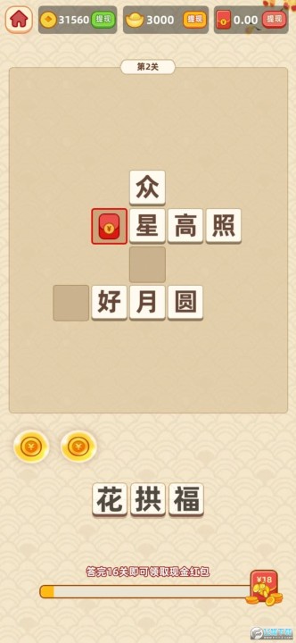 2、每个界面有不同的提示手段,帮助玩家找到隐藏的成语字。