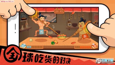 点开游戏,画面是鲜艳明亮的红黄配色,激发起满满的食欲。游戏的画面风格灵感则来自于日本相扑,“胖”和“吃”的元素无处不在,小胖纸们看了就让人心情愉快。进入游戏点击开始后日式拉门将会打开,露出其后的食物满满的居酒屋。玩家在这个界面可以选择和好友线下对战或是联网寻找对手大战一场。