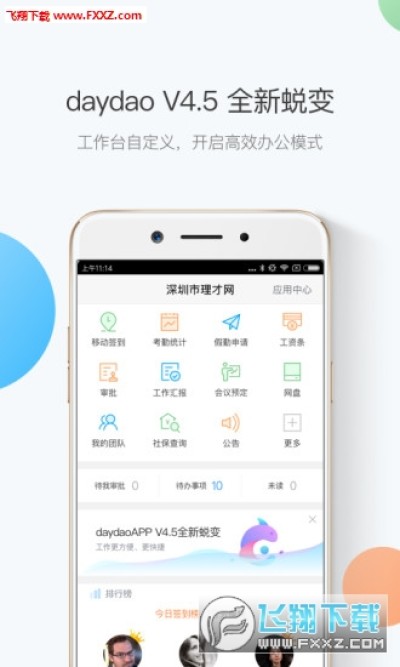 daydao APP实行了“功能订阅”模式,用户可以自选常用的功能进行集中显示。V4.5延续了这一优势,同时做了两点优化:自定义界面灵活性更强,HR、办公类功能应用分工更清晰。随时增删,一步到位,十分便捷。