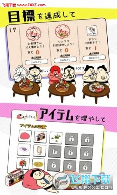 《相扑选手餐厅》是一款模拟经营类游戏,在游戏中玩家要经营一家餐厅,要给相扑选手们提供吃的东西,还要为他们准备住的地方,以此来获得金钱,然后就可以解锁各种休息的道具了,玩家的目的就是解锁更多道具,为相扑选手们提供更多休息的地方,喜欢这款游戏的玩家千万不要错过!!!