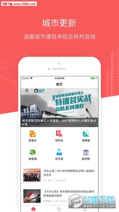 拥有云端报建宝、拓展研判宝、项目公告榜、指标速算器、城市更新政策通、问题找专家、城市更新商学院、干货+号外等8大功能。