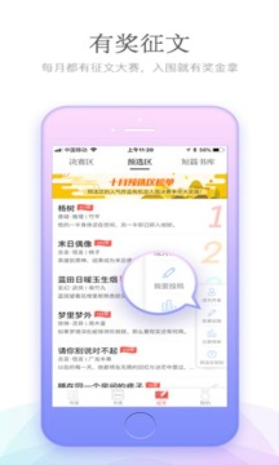 小红花阅读征文大赛是给喜欢写作的童鞋开设的“短篇征文pk赛”超好玩的投票方式,超刺激的晋级赛制,长期火爆征集中!参考规则进行分区投稿“她”“他”“ta”三个频道,月度决赛胜出者可获得奖金奖励,参与投票的读者也可以享有高额返奖同时下载小红花阅读app,查看所有征文!提前了解投稿作者文章内容。