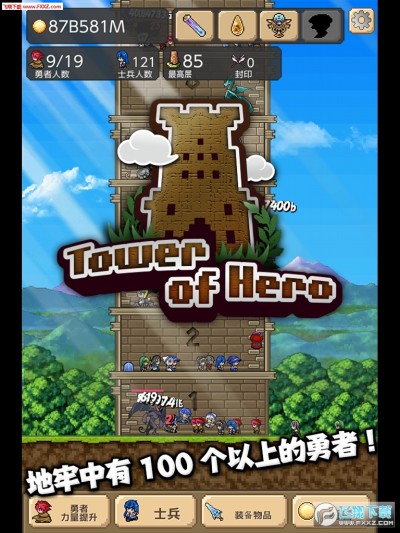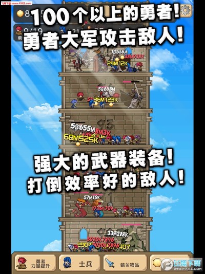 这是一款玩法非常特别的RPG游戏,玩家点击屏幕可以召唤一定数量的勇者前去挑战高塔,有些勇者战败了,但是战胜的会前往上一层,如此这般一层一层的往上去消灭怪物,看你能挑战到多少层呢。当然还可以招募各种类型的士兵,剑士、射手、忍者、骑士等等让它们自动前去挑战,就像放置类游戏。此外无论勇者的召唤数量、勇者的等级,还是各类士兵的等级都可以提升,还有丰富的装备系统,相当有趣