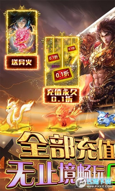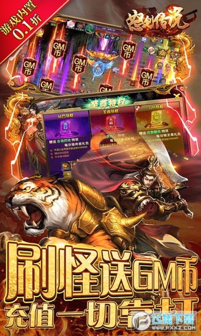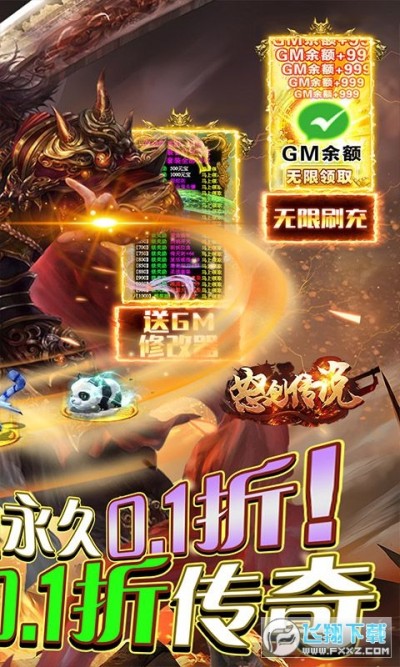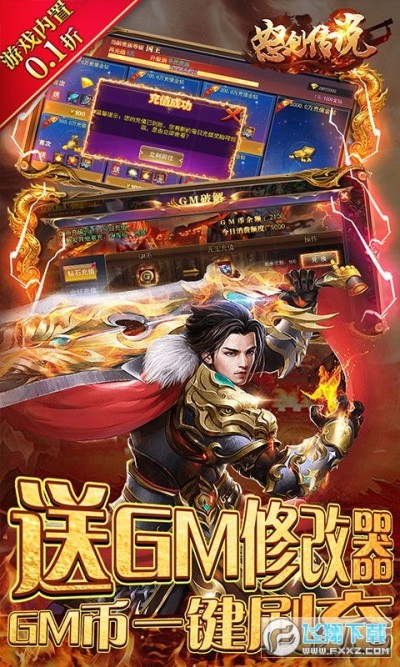《怒剑传说》0.1折超爽版,全部充值永久0.1折!上线送铂金贵族、GM1、限时体验时装、3W福利金钻、500W钻石、1000GM币。主线送炫酷异火,提升爆率属性飙升!再送GM修改器,GM币一键刷充!全新贵族悬赏,刷怪即可得GM币!超爽百倍爆率,万物皆可爆,充值全靠打!