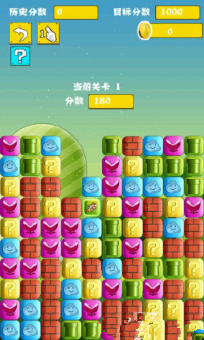 2、游戏的玩法是建立的传统的三消模式上面,点击颜色一样的方块,相邻越多相处越多,屏幕上方可以看到分数