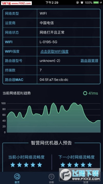 2. 首页显示wifi/基站信息、网络延时趋势、机器人预告和对局等信息。