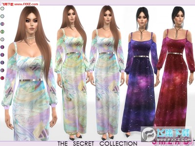 由“TSR - sims2fanbg”制作,一款女士的裙子,吊带和开袖的设计,很薄的纱质材质,布面是水彩和星云的涂色,长度刚好到脚,感觉还挺气质的,10种配色。
