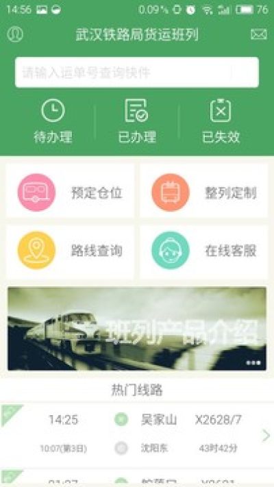 武铁货运订仓系统是武汉铁路局独家研发的预订铁路货运班列的手机终端APP,致力于为货主提供便利化、智能化、精细化、透明化、实效化的服务。用户通过本系统,可预订武汉铁路局开行的所有货运班列仓位、查询班列运行时刻、追踪货物运行轨迹、了解有关货运业务等。