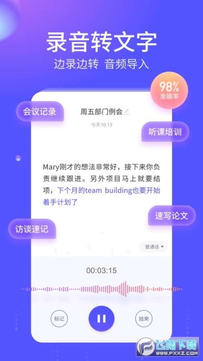 手机直接开始录音,一边录音一边转换文字,实时查看文字结果,录音结束后一键保存录音和文本