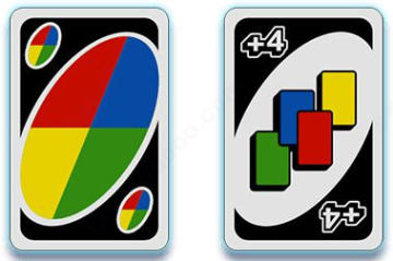 包括变色牌(改变当前出牌颜色)与变色加4牌(变色并使下家抓4张牌)。在任何条件下均可打出并改变下家出牌颜色。两种万能牌各有4张。变色牌、变色加4牌