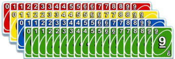 数字牌由红、黄、蓝、绿4种颜色组成,每种颜色都有数字为0~9的牌。数字牌每色有19张,1~9数字牌每色各2张,0数字牌每色各1张,共76张。