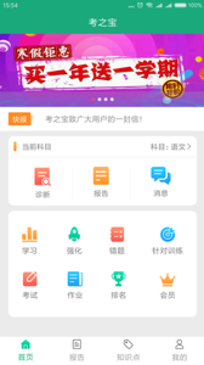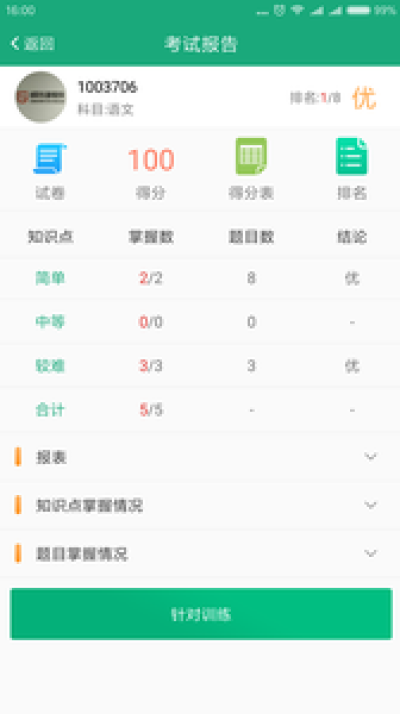 考之宝记录了用户学习轨迹、测试记录,将错题、未掌握知识点汇总,学习情况、进度一目了然。避免时间和精力的浪费。 通过阶段性的学习后,用户可对学习效果进行检测,测试后系统都会根据当前测试生成测试报告,系统通过以往历年真题考试数据与众多用户测试结果进行大数据下的诊断分析,生成诊断报告,并分别从成绩情况、题目完成情况、知识点分布及知识点掌握情况进行分析。报告结果完全体现出用户在该科目上知识点的掌握情况,突出体现相对薄弱知识点,并且根据考试出现频率、考生易错频率等,进行知识点星级分类,以便重点复习、精确提高。