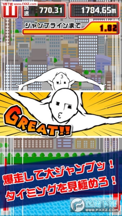 助跑阶段需要快速交替点击红蓝按钮,还要在极短的跳跃区内点击黄色按钮跳出,之后就不用管了,看主角能一脸舒爽飞到多远。