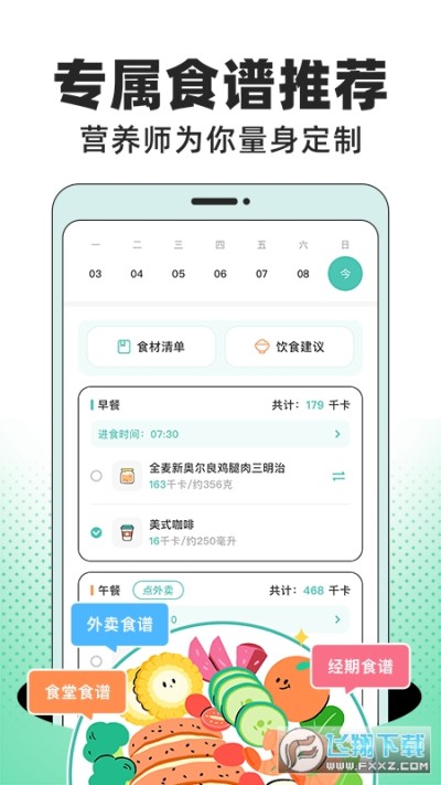 专属食谱支持替换食物,同时也为女生们准备了专属的经期食谱,呵护生理期的同时也能安心瘦奥~