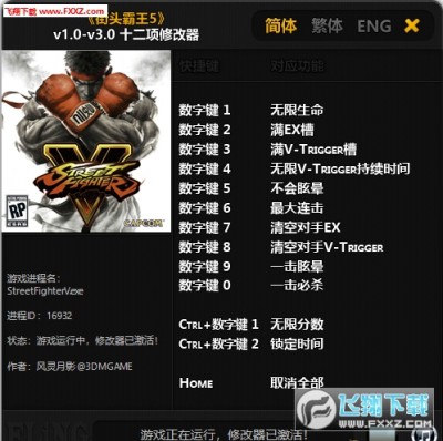 街头霸王5:街机版 v1.0-v3.0 十二项修改器,一共可以给玩家提供无限生命、满EX槽、最大连击、一击必杀等等极为强大的功能,对此感兴趣的玩家朋友们欢迎前来下载哦!