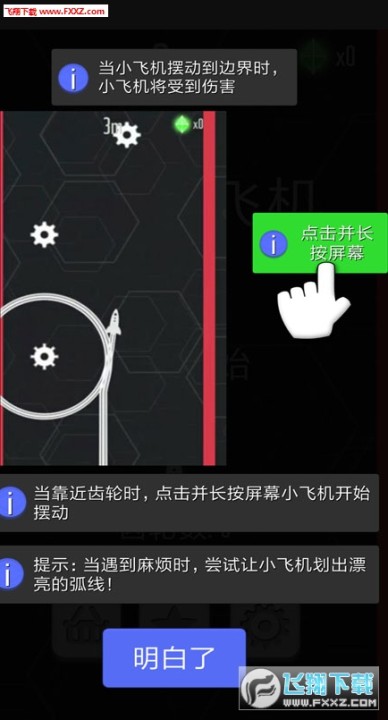 这是一个非常简单的游戏,但是一般坚持不到10秒钟。摇摆的小飞机,你能坚持多少秒。这是一个超级上瘾的休闲游戏!这个游戏是一个“近乎无尽的”风格的飞行游戏,飞行中你要避免碰撞障碍或边界并获得最高的距离!如果你足够靠近齿轮,你可以在齿轮障碍物周围摆动。这是一个有趣的旅程!但是很难做到,你能走到最后吗?