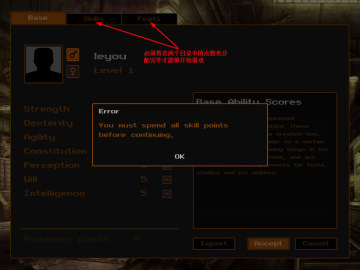 如果游戏进入时提示以下问题,请点击上方的skills和feats来查看是否技能点已经分配完毕。