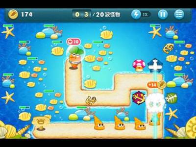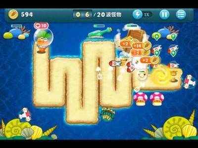 操作很简单,只需点击地图中闲置区域就可以安置炮塔,而在游戏过程中,每个炮塔都有可继续升级两次以达到顶级,升级后不只外形变化,其输出也变得更加强大。不要看游戏里的各种设置都是可爱范,但是它们都具备着不凡的威力,有偏向输出型(魔法球和汽油瓶)或干预型(减速的便便和冰冻星星),有长距离的攻击,大面积群体攻击(太阳),以及能以一片飞叶扫全屏的风扇。